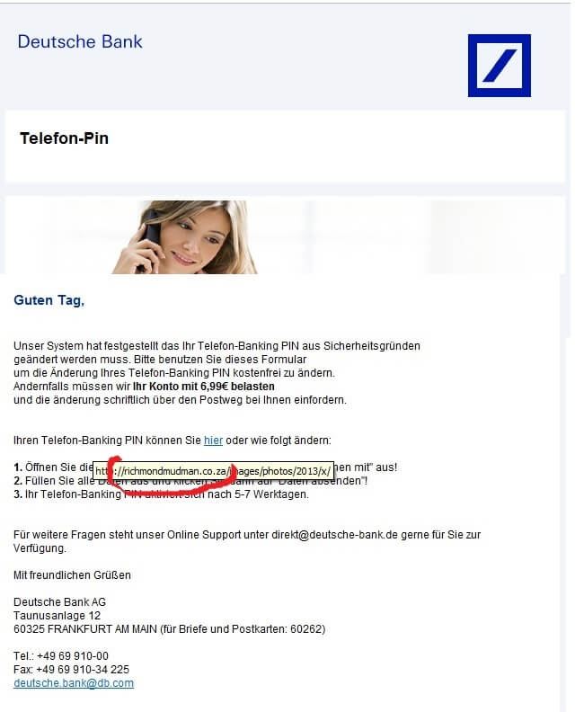 Aber der Link im Text, den sollte man sich genauer anschauen. Der verweist auf eine URL mit dem Namen „richmondmudman.co.za„. Das dürfte mit Sicherheit keine Seite der Deutschen Bank sein. Da ich nicht weiß, was dahinter liegt, klicke ich lieber nicht drauf.